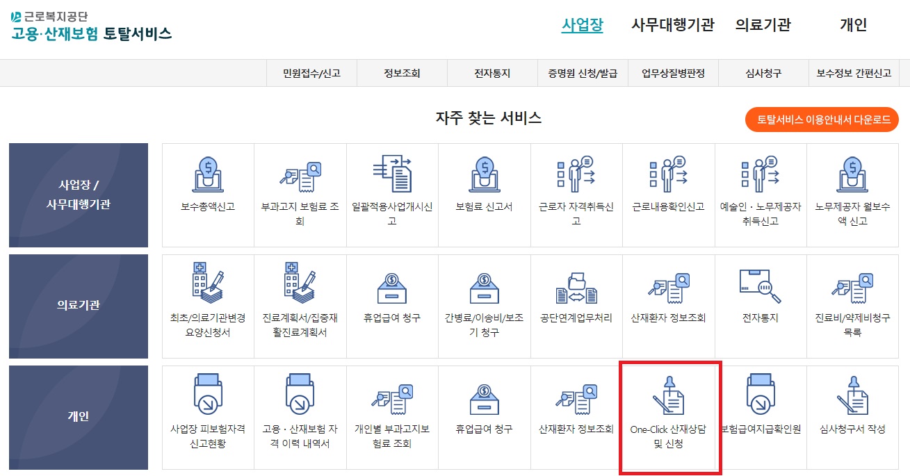 고용ㆍ산재토털 서비스로 연계되어 의료기관에 전달됩니다. 의료기관에서는 산재신청서에 소견서를 첨부 공단에 제출하면 산재신청이 완료되므로 산재근로자는 공단이나 의료기관을 방문할 필요 없이 산재신청을 할 수 있습니다.