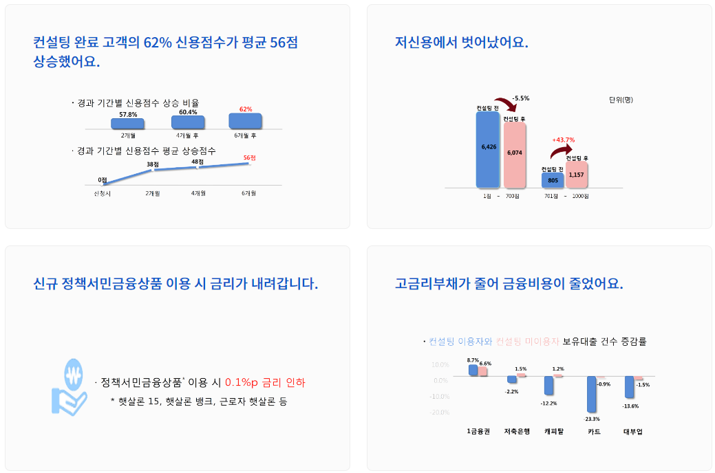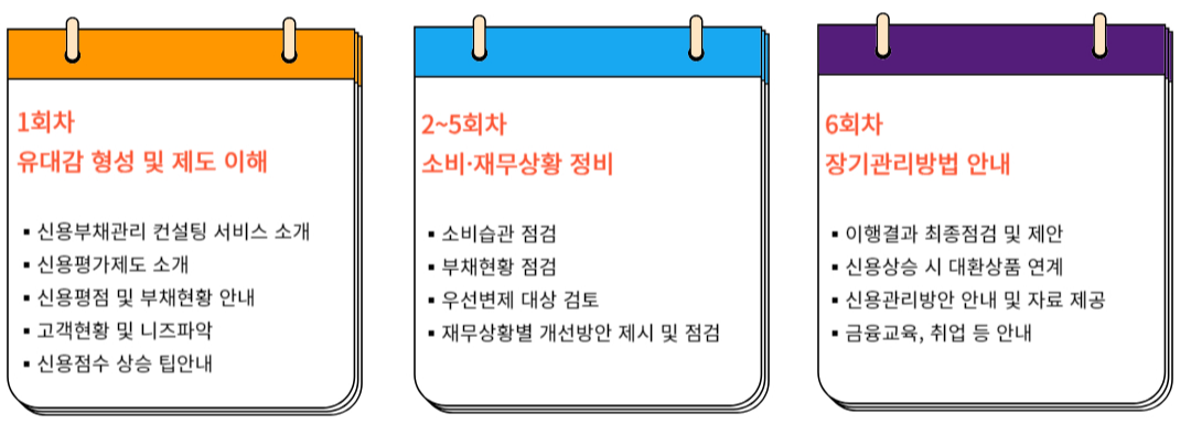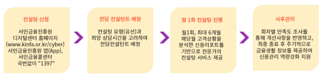정책서민금융을 이용 중이거나 지원대상 요건에 부합하는 분을 대상으로, 금융 전문 컨설턴트가 월 1회 신용과 부채 상태를 점검해 금융비용경감 솔루션을 제공하는 1:1 맞춤형 무료 컨설팅입니다.