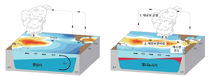 적도부근 열대 태평양은 지구상에서 가장 많은 태양에너지가 유입되는 곳으로 평소 서태평 양의 해수면 온도는 상대적으로 높고 동태평양은 낮은 해수면 온도 분포를 보입니다. 바람이 약화됨에 따라 남미 연안에서는 평상시 바다 밑에서 올라오던 차가운 물이 상승하지 못하게 되어 동태평양의 해수면 온도가 평년보다 높은 상태로 수개월간 지속되는 현상이 바로 엘리뇨입니다.